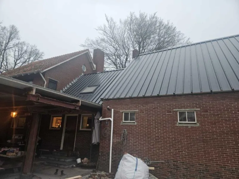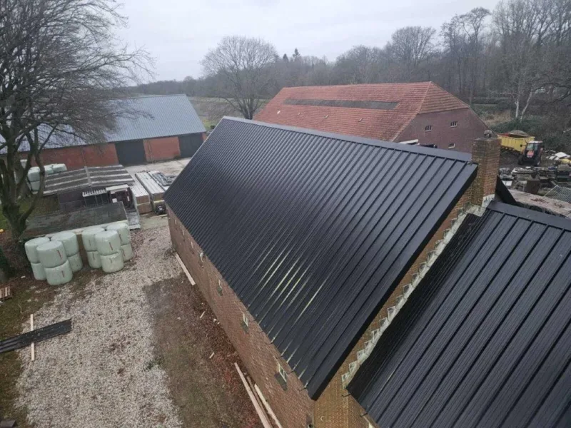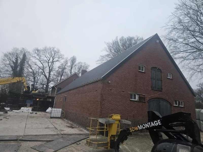 In Bellingwolde zijn zowel een boerderij als de bijbehorende schuur grondig gerenoveerd. Ruim 1.000 m² asbesthoudende golfplaten en 480 m² oude dakbedekking zijn zorgvuldig verwijderd en vervangen door nieuwe geïsoleerde dakpanelen. Het achterhuis kreeg een strak zwart dak met ingewerkt dakraam, terwijl de schuur is voorzien van antracietkleurige panelen. Nieuwe naadloze aluminium dakgoten en hemelwaterafvoeren maken de renovatie compleet en zorgen voor een duurzaam en verzorgd eindresultaat.