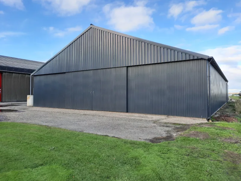 De bestaande houten gevels zijn bekleed met wandprofielplaten 35-1035 in de kleur Antraciet. In de voorgevel schuiven de deuren vóór de bestaande gevel langs; daarom hebben we hier gekozen voor laagprofiel 10-1100, dat we ook op de deuren zelf hebben toegepast voor een strak en uniform geheel.