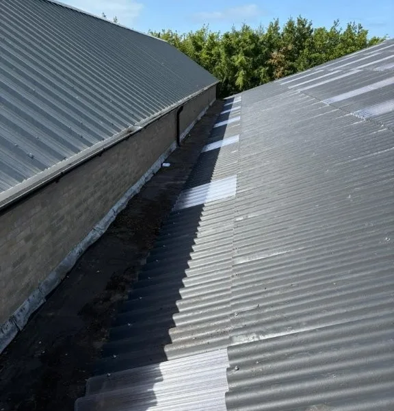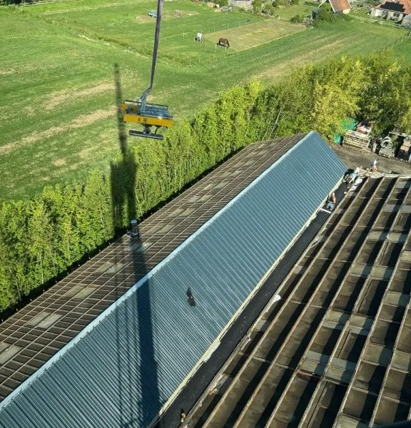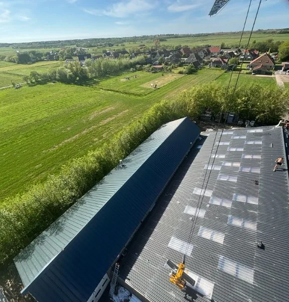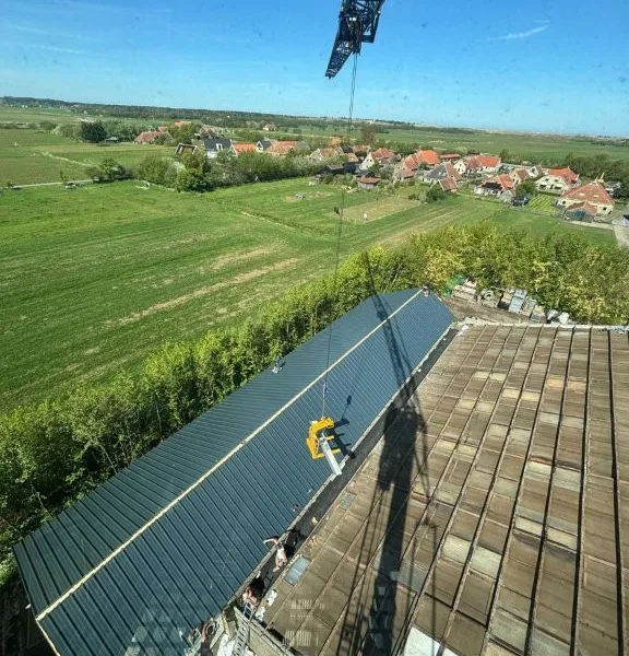 Op Terschelling is een omvangrijke dakrenovatie uitgevoerd, waarbij de logistiek door de eilandlocatie een extra uitdaging vormde. In totaal zijn ruim 1.200 m² asbesthoudende golfplaten verwijderd en vervangen door nieuwe dakoplossingen: één schuur kreeg donkergrijze Humanit golfplaten, de andere geïsoleerde dakpanelen. Daarnaast zijn naadloze aluminium dakgoten en hemelwaterafvoeren aangebracht, is de tussengoot met EPDM duurzaam afgewerkt en is een elektrisch bediende overheaddeur geplaatst. Het resultaat is een veilige, duurzame en toekomstbestendige renovatie.